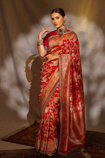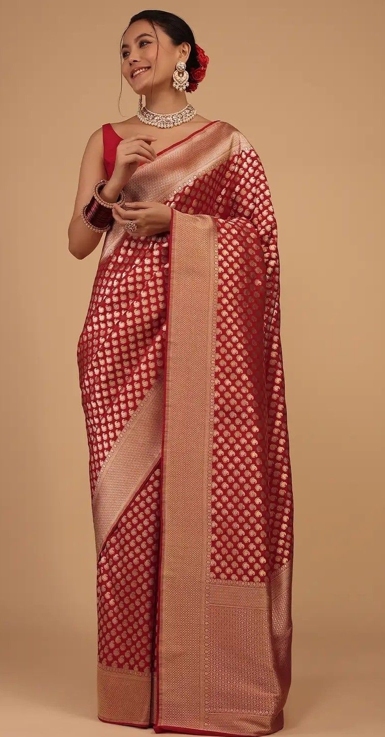 A Lal Banarasi saree is a timeless symbol of grace and tradition. Crafted in fine Banarasi silk, this saree features rich red tones that reflect elegance and cultural heritage. Intricate zari work, woven with gold or silver threads, adds a luxurious shine to the fabric