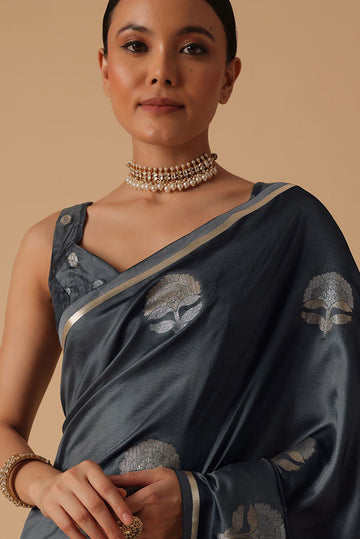 Elegant and understated, this grey saree exudes timeless sophistication. Crafted from a refined, lightweight fabric, it features a soft sheen and delicate detailing that add a graceful touch. Perfect for formal occasions or evening events, it pairs beautifully with both subtle and bold accessories. Its neutral tone allows versatile styling, creating an effortlessly chic look.